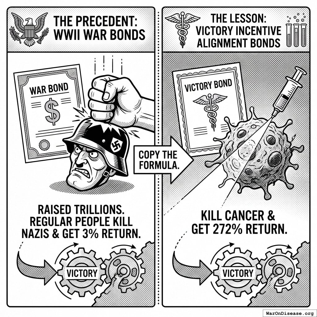 The Lesson: VICTORY Incentive Alignment Bonds copy the formula. Except instead of killing Nazis for 3%, you kill cancer for 272%.