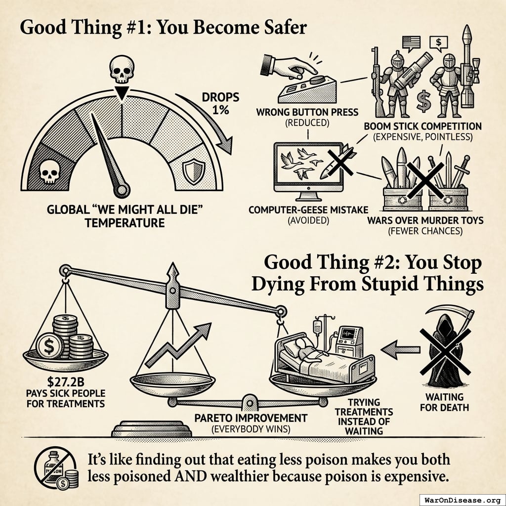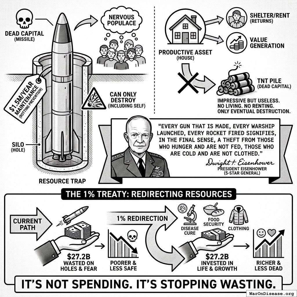 A 1% treaty doesn’t ask you to spend $27.2B curing diseases. It asks you to stop wasting $27.2B on things that sit in holes making you poorer and less safe, and redirect those same papers to things that make you richer and less dead.
