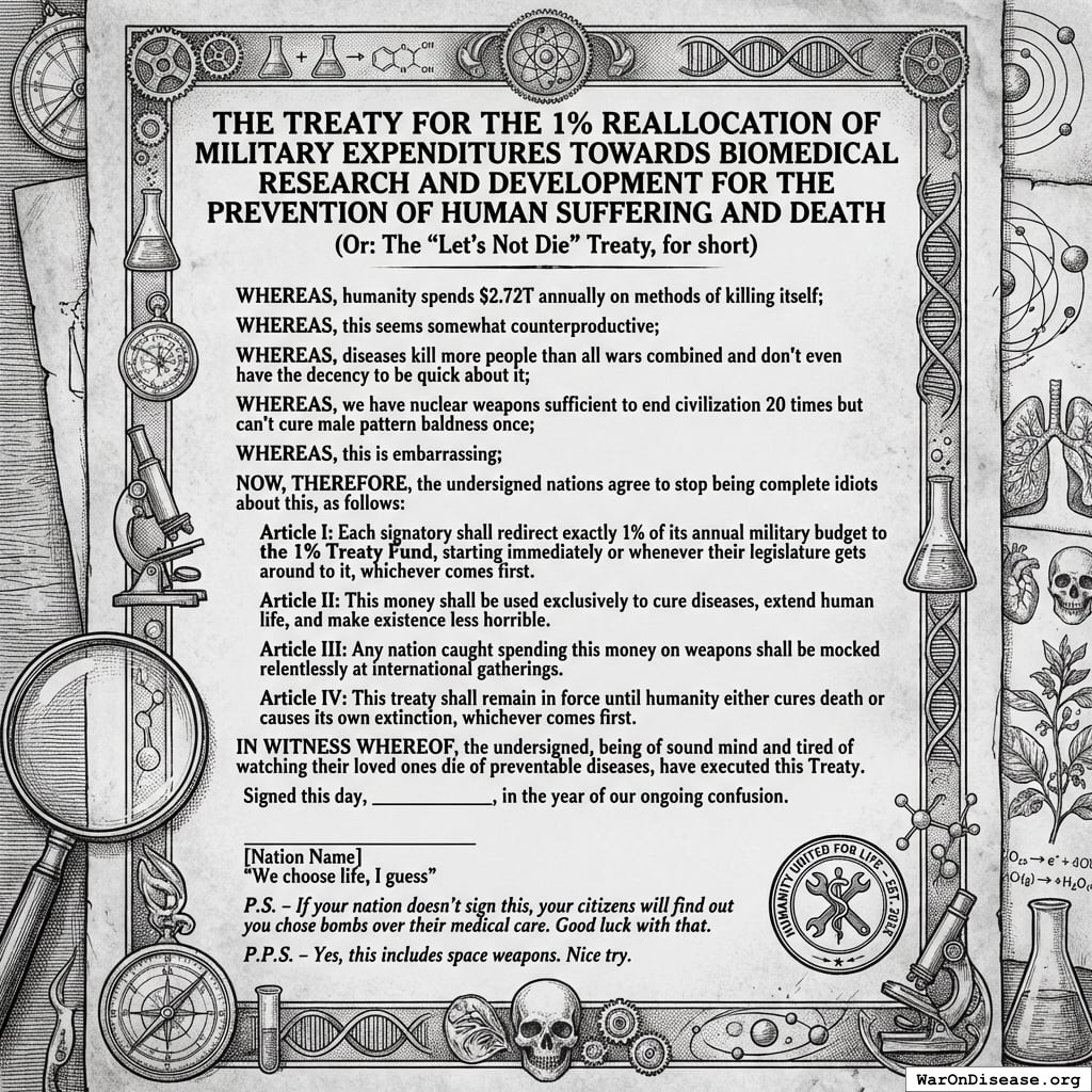 “We, the undersigned nations, being of sound mind and tired of dying, hereby agree to redirect 1% of our annual military expenditure to not dying instead.”