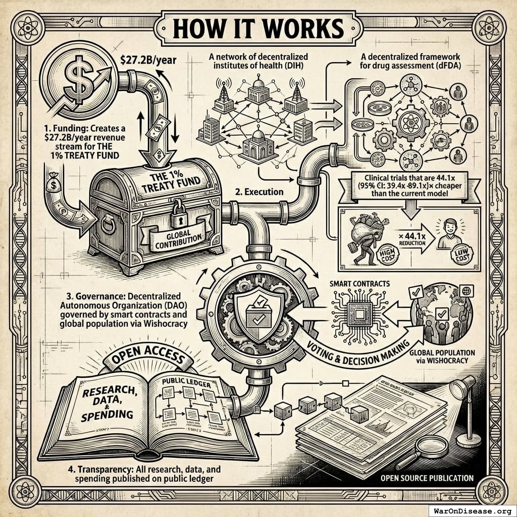 - Execution: A network of decentralized institutes of health (DIH) subsidizes patient participation in a decentralized framework for drug assessment (dFDA), clinical trials that are 44.1x (95% CI: 39.4x-89.1x) cheaper than the current model