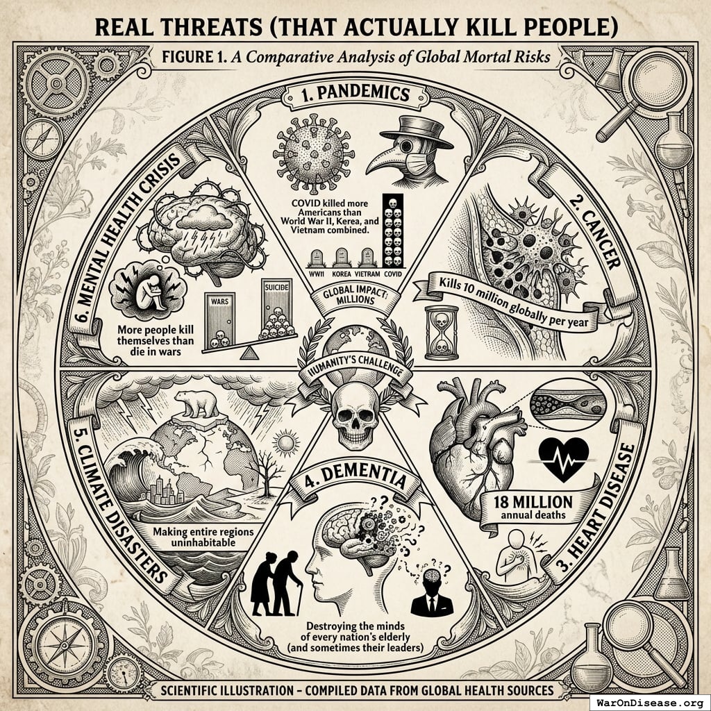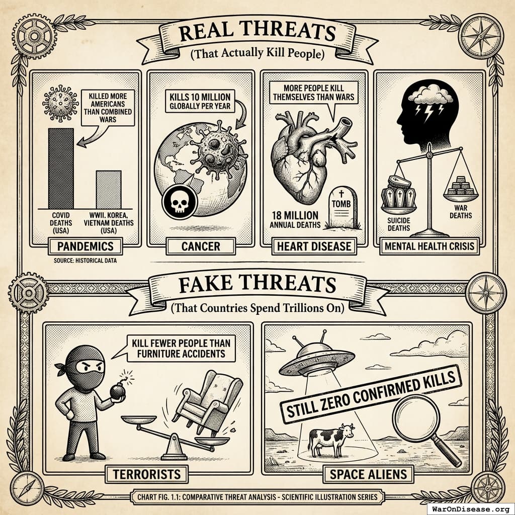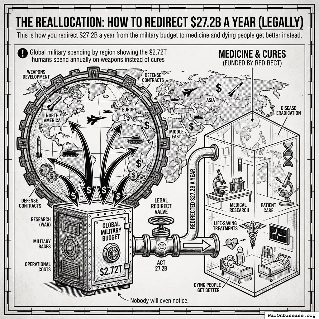 The Prize: That 1% - that $27.2B per year - goes into a global fund to cure the diseases that are actually killing people, unlike the bombs which are mostly just sitting around getting dusty and occasionally almost ending the world by accident.