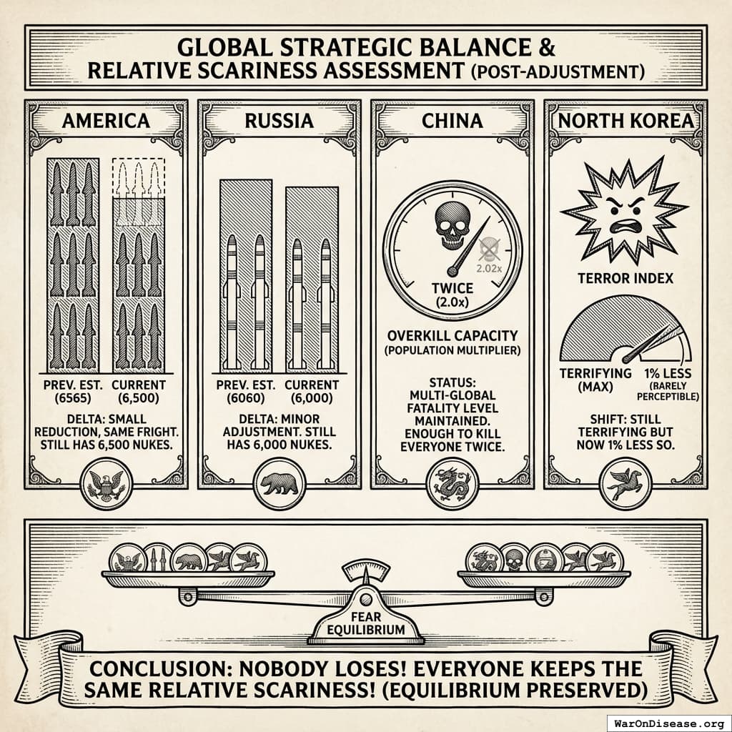 Current Situation: Every country spends billions on weapons to be exactly as scary as other countries with weapons. Like a very expensive, very deadly Mexican standoff that’s been going on since 1945.
