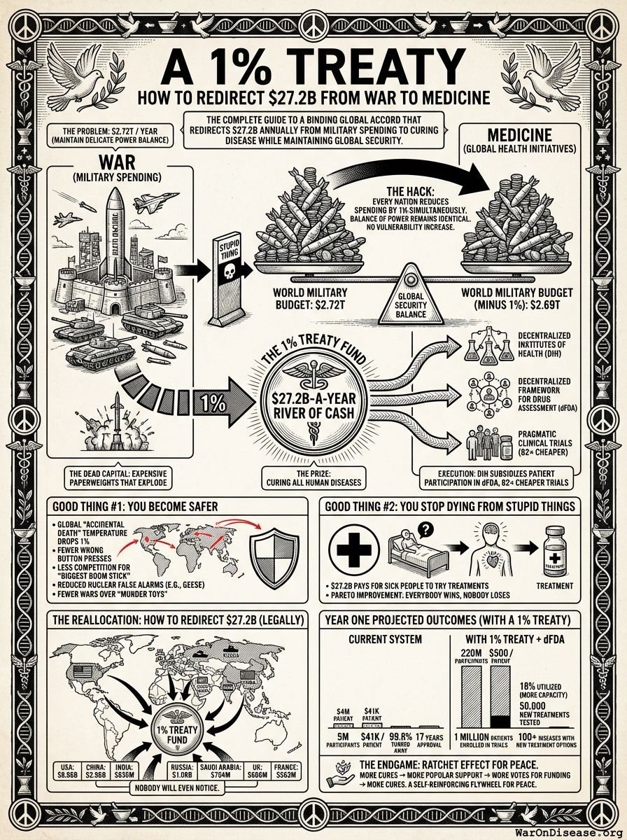 The 1% Treaty is a legally-binding global accord with a single provision: every signatory nation redirects 1% of its annual military budget to the 1% Treaty Fund, which finances global health initiatives like your decentralized institutes of health (DIH).