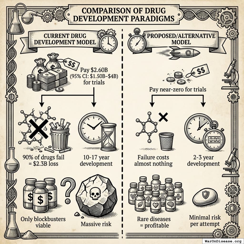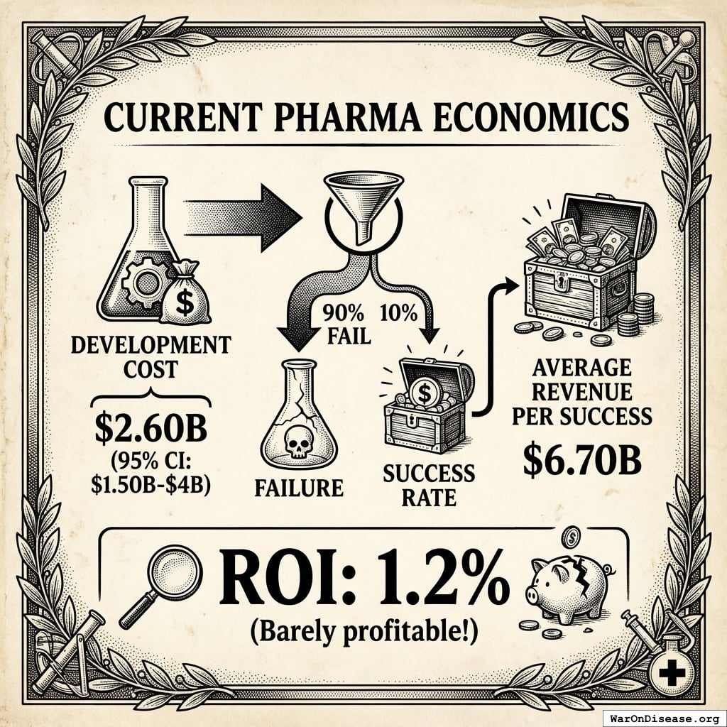 - R&D costs: $2.6B per drug (unsustainable)