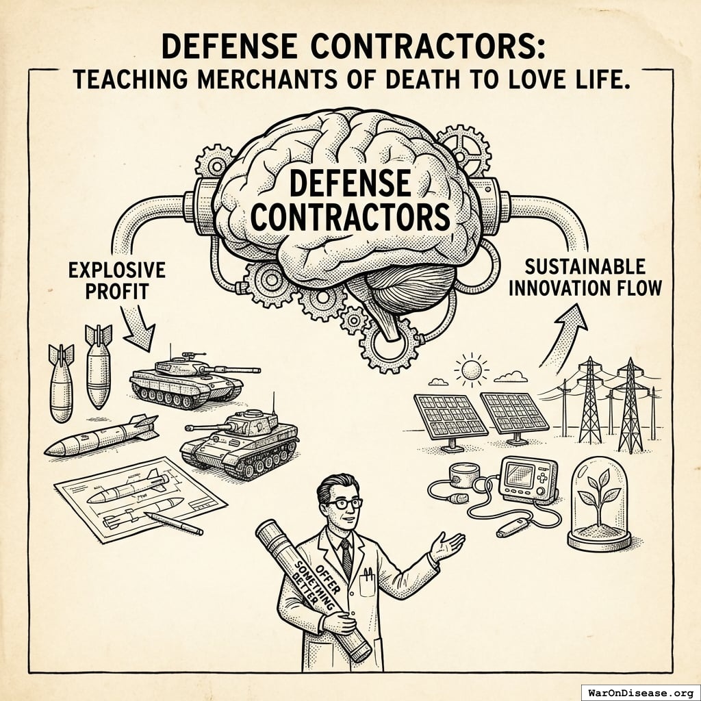 Defense contractors aren’t evil. They’re just following the money. Currently, that money comes from building things that explode. You’re going to offer them something better.