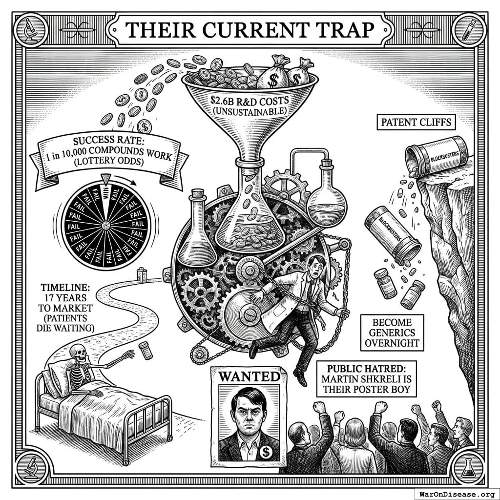 Pharma companies aren’t evil either. They’re trapped in a broken business model that rewards treating symptoms forever instead of curing diseases once. Here’s how you free them.