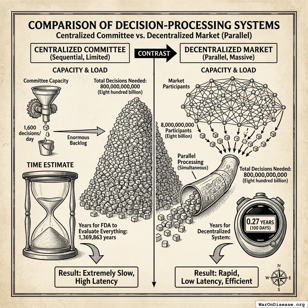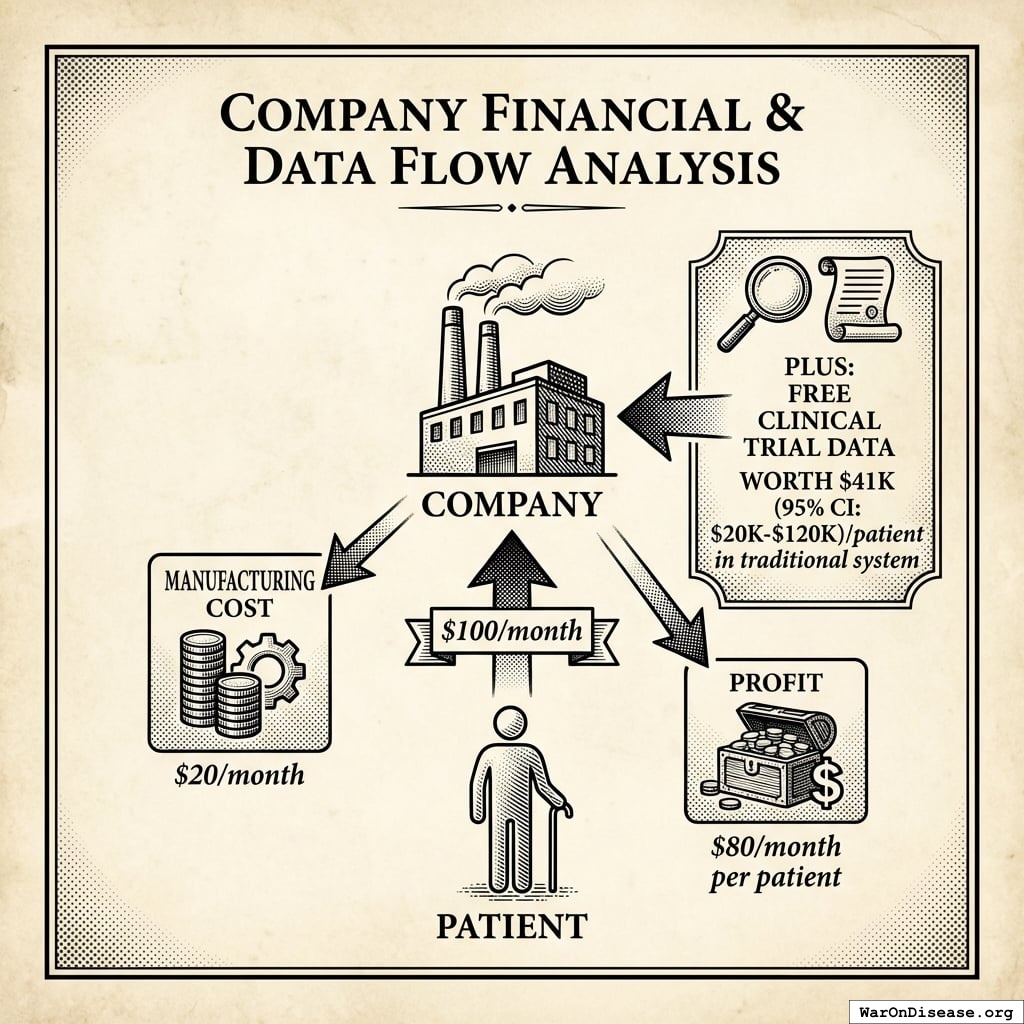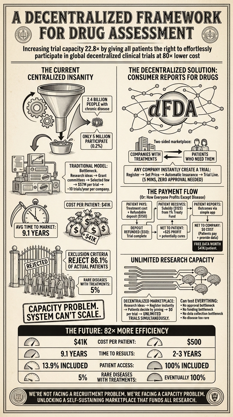 Traditional trial: Pharma spends $57M, tests most profitable drug only Decentralized trial: Pharma spends $0, tests everything including supplements, food, lifestyle, off-patent drugs
