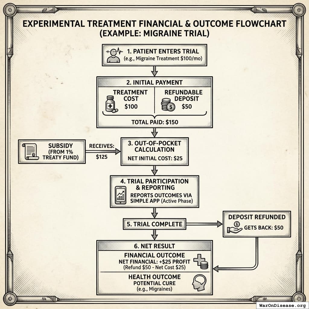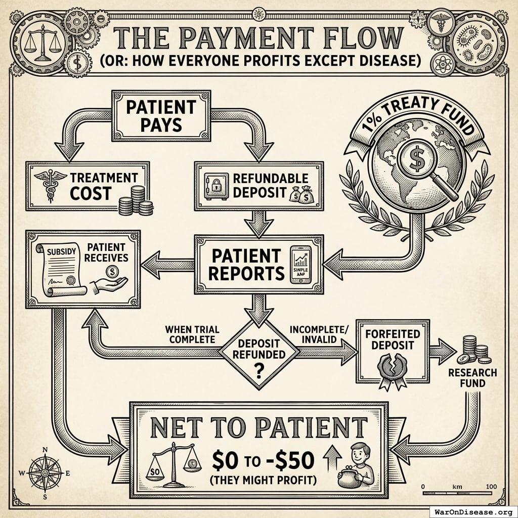 Patient pays: Treatment cost + Refundable deposit Patient receives: Subsidy (from a 1% Treaty Fund) Patient reports: Outcomes via simple app Deposit refunded: When trial complete Net to patient: $0 to -$50 (they might profit)