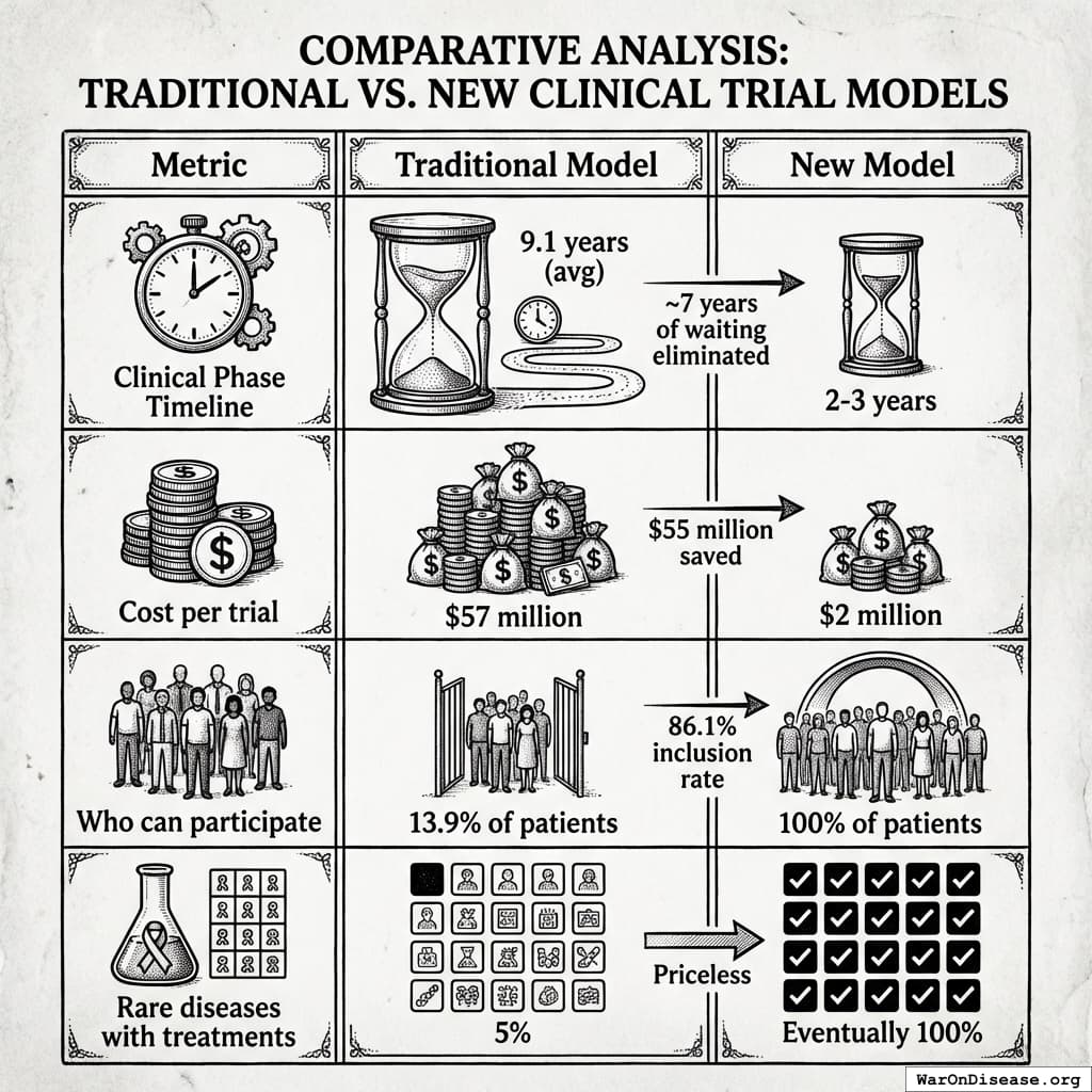 This isn’t because people don’t want to help find cures. It’s because the current system can’t scale. Trials cost $41K (95% CI: $20K-$120K) per patient, require traveling to major medical centers, and have exclusion criteria that reject 86.1% of actual patients2.