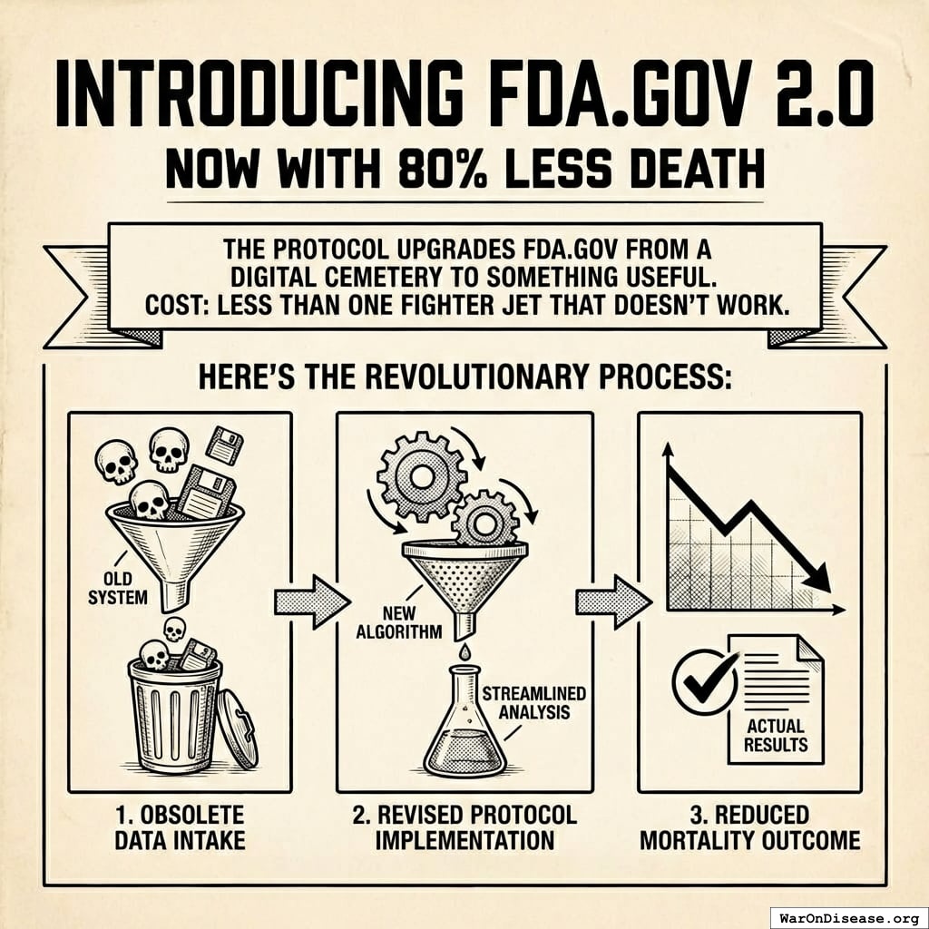 The protocol upgrades FDA.gov from a digital cemetery to something useful. Cost: Less than one fighter jet that doesn’t work.