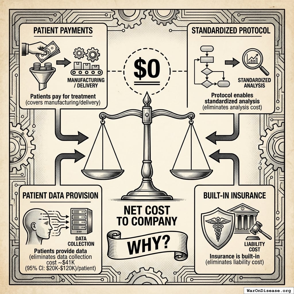 - Patients provide data (eliminates data collection cost ~$41K (95% CI: $20K-$120K)/patient)