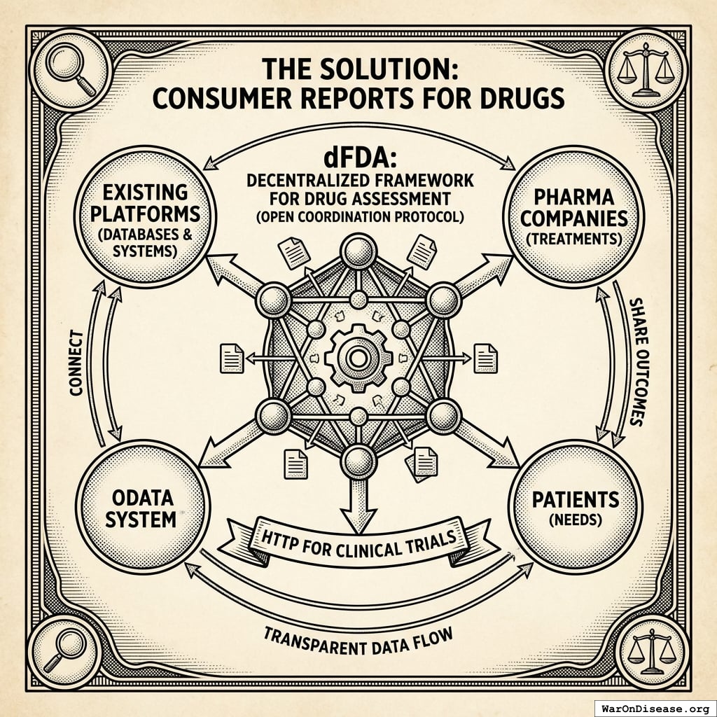Your decentralized framework for drug assessment (dFDA) is an open coordination protocol that enables existing platforms to connect companies with treatments to patients who need them. It’s HTTP for clinical trials - a standard that lets all the existing systems talk to each other and share outcomes.
