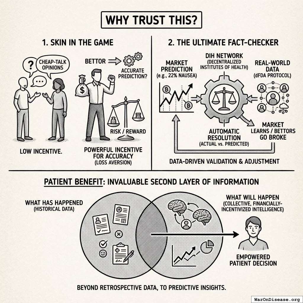 - The Ultimate Fact-Checker: Your decentralized institutes of health (DIH) network automatically resolves these bets using the actual, aggregated, and anonymized patient data collected through the dFDA protocol. If the market predicts a 22% rate of nausea, and the real-world data shows 40%, the market learns and adjusts, or bettors go broke.