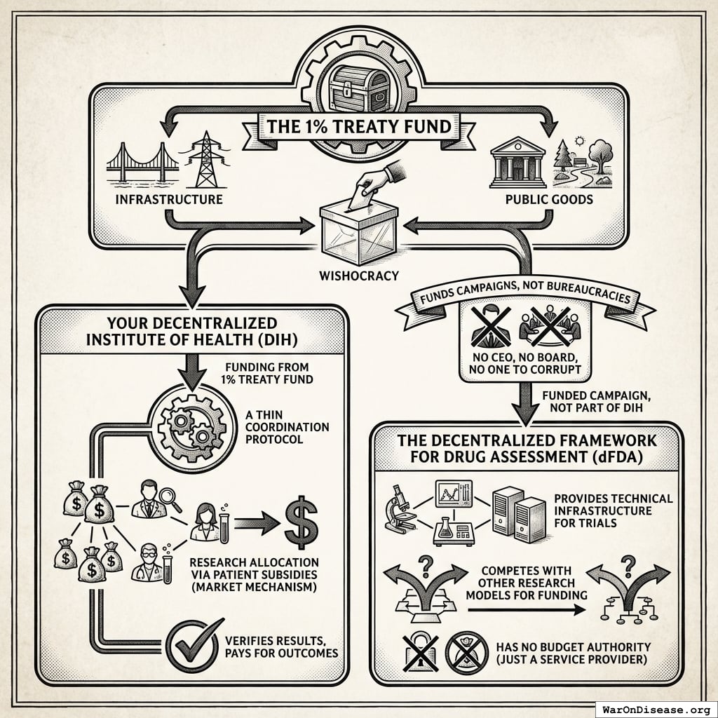 Everything operational is outsourced. Trial infrastructure? That’s dFDA’s job. Task decomposition? AI services. Talent matching? Existing marketplaces. Crowdfunding? Existing platforms.