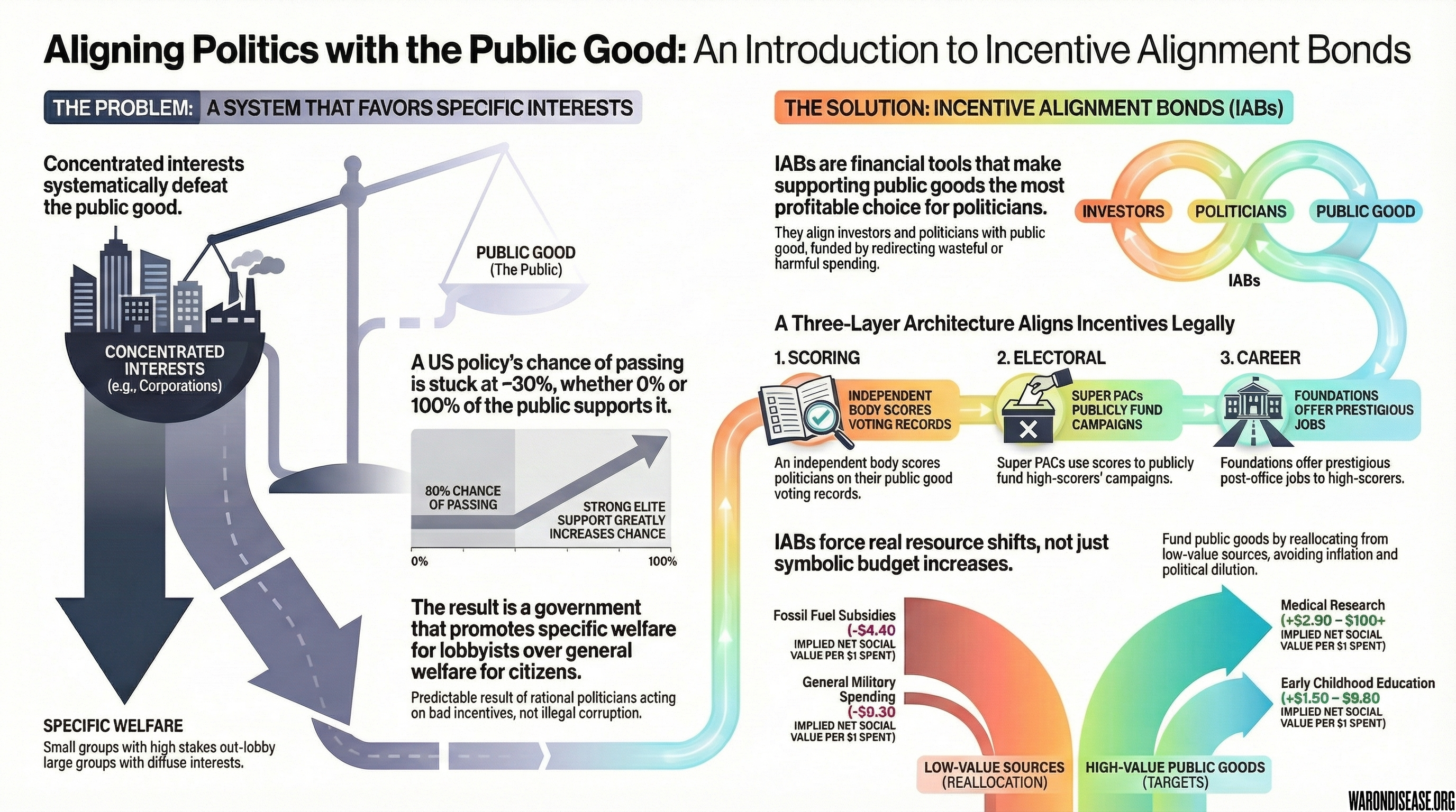 The key innovation: IABs align both investors and politicians with public-good outcomes through a single instrument. Investors provide capital to pass the policy. Politicians get career benefits for supporting it. The policy outcome funds everything.