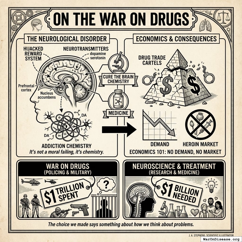 We spent $1 trillion fighting drug dealers with guns. We could have spent $1 billion fixing the neurochemistry with medicine. The choice we made says something about how we think about problems.