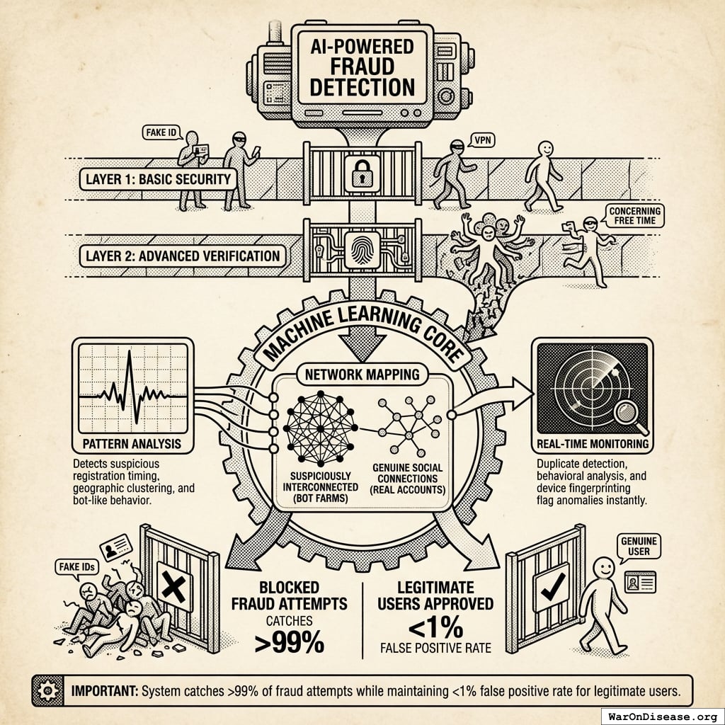 - Pattern Analysis: Detects suspicious registration timing, geographic clustering, and bot-like behavior
