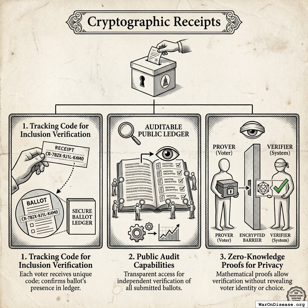 - Individual Verification: Each voter gets a cryptographic receipt proving their vote was counted