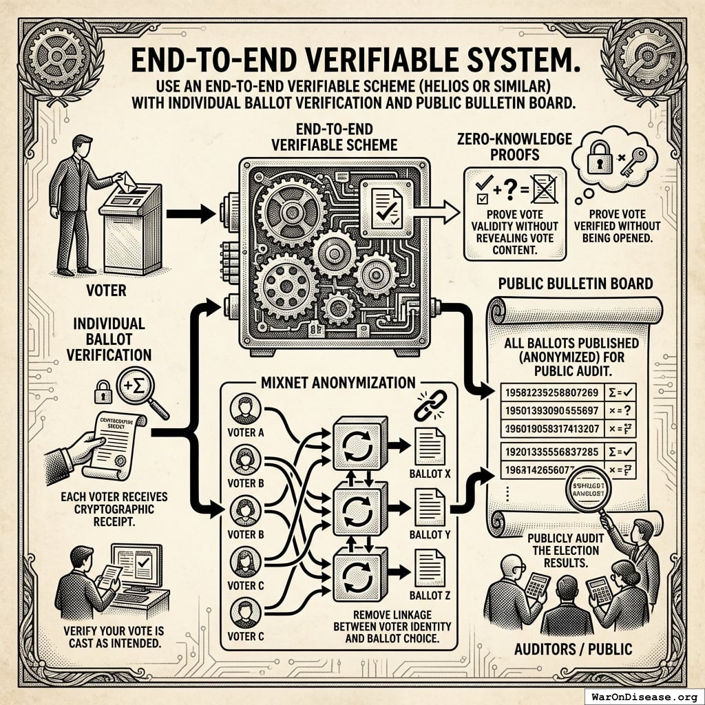 The voting system uses an end-to-end verifiable scheme (like Helios138). Translation: cryptographic receipts that prove you voted, without proving how you voted. Politicians can claim polls are fake. They cannot claim math is fake. (Some have tried. It doesn’t go well.)
