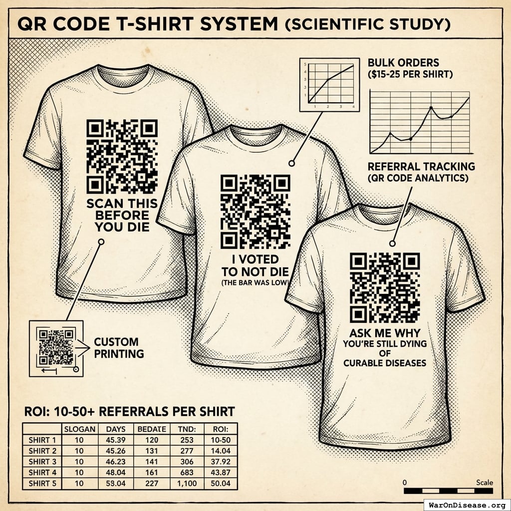 - Slogans: “Scan This Before You Die” / “I Voted to Not Die (The Bar Was Low)” / “Ask Me Why You’re Still Dying of Curable Diseases”