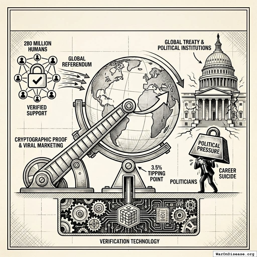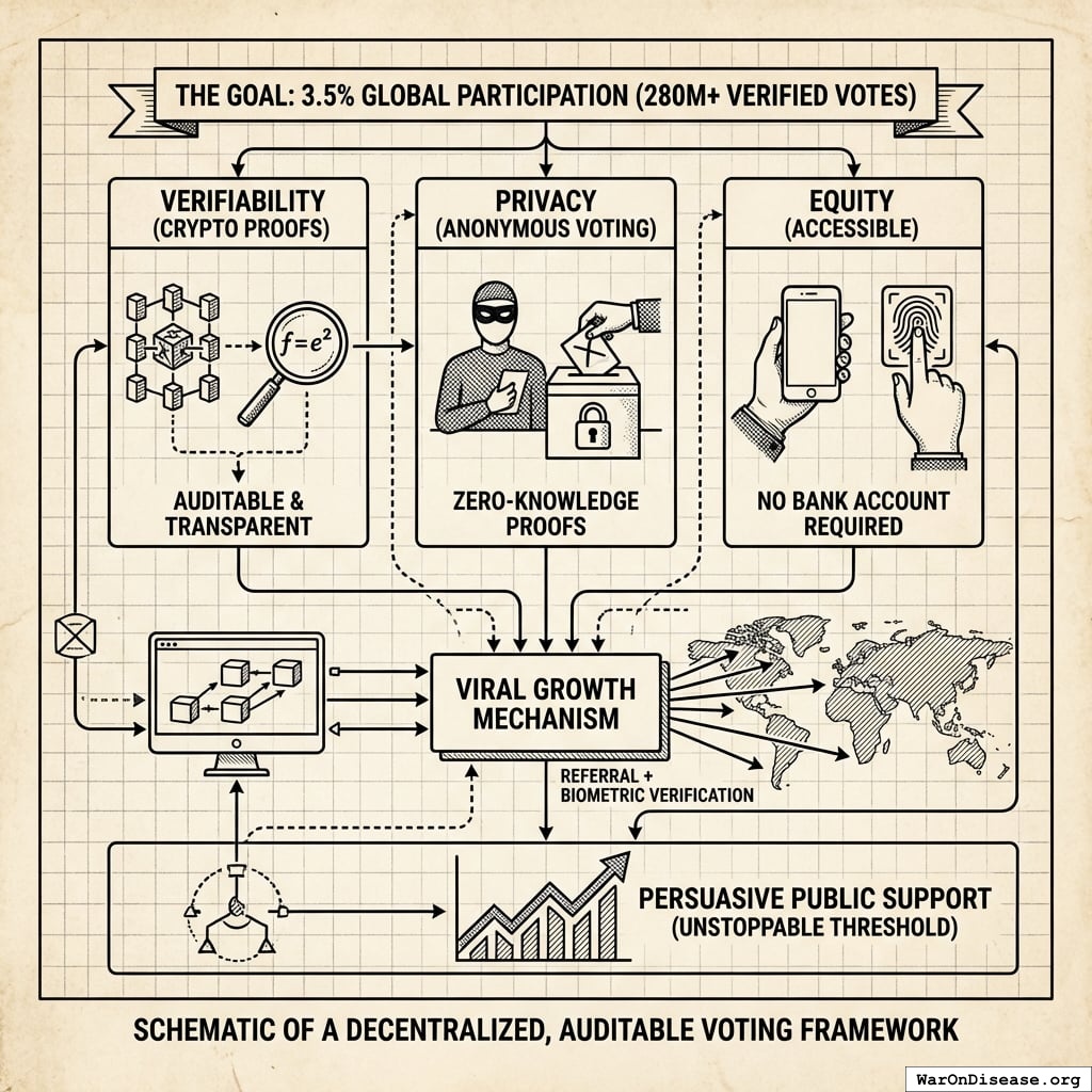 Build a privacy-preserving, globally verifiable referendum that shows public support for a 1% treaty and decentralized institutes of health (DIH).