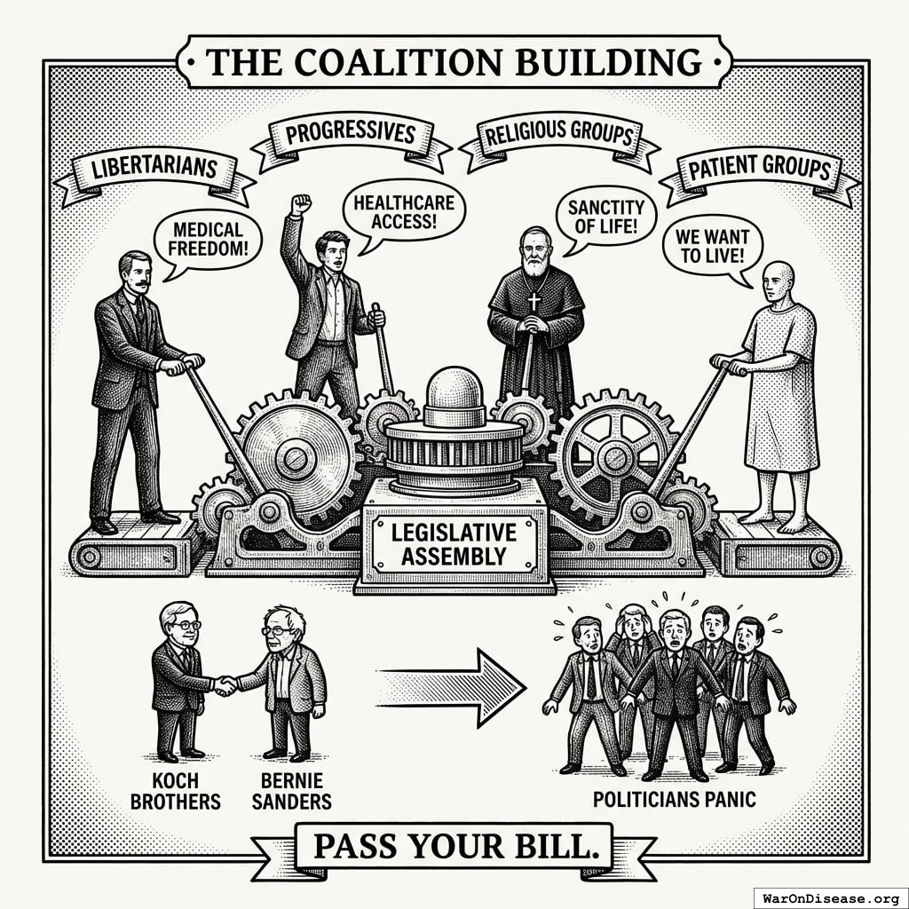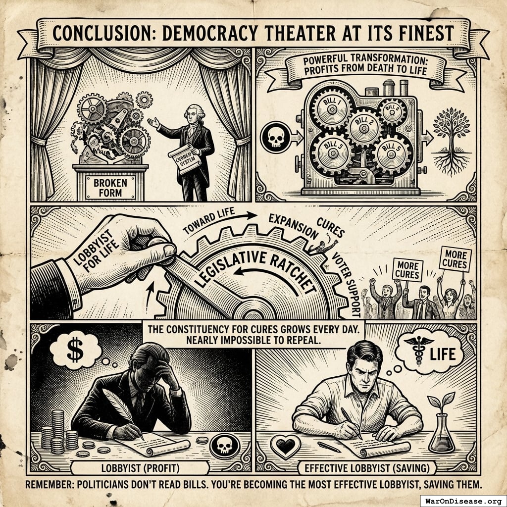 Here’s how democracy actually works: Lobbyists write bills, give them to politicians who can’t read, and those politicians vote based on who donated most to their campaign. You’re about to become the best lobbyist in history, except your bills actually help people instead of killing them.