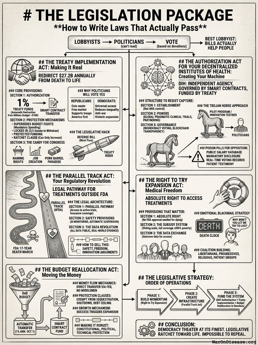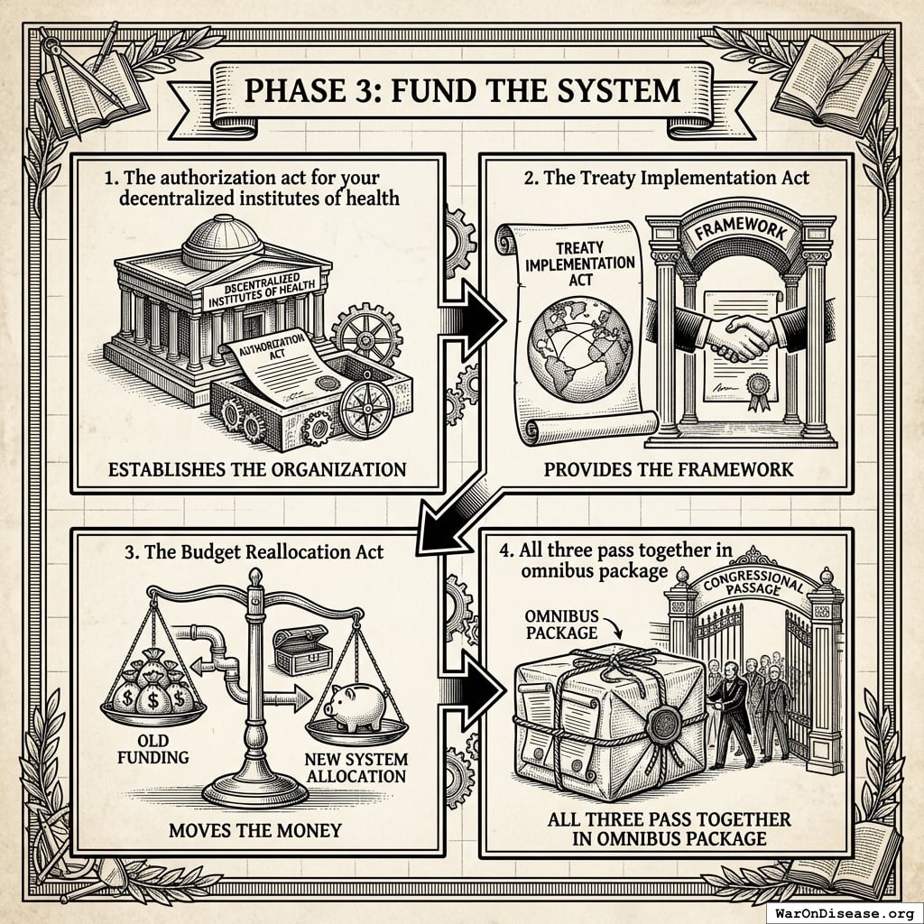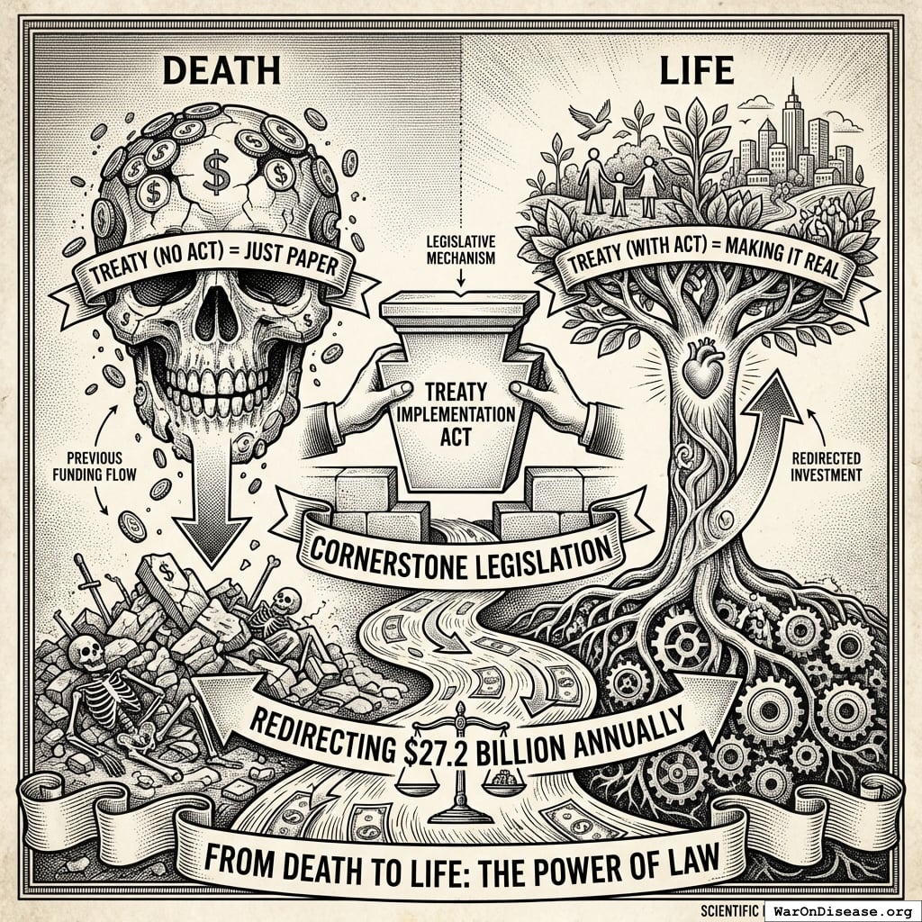 This is your cornerstone legislation. Without it, the treaty is just paper. With it, you redirect $27.2B annually from death to life.