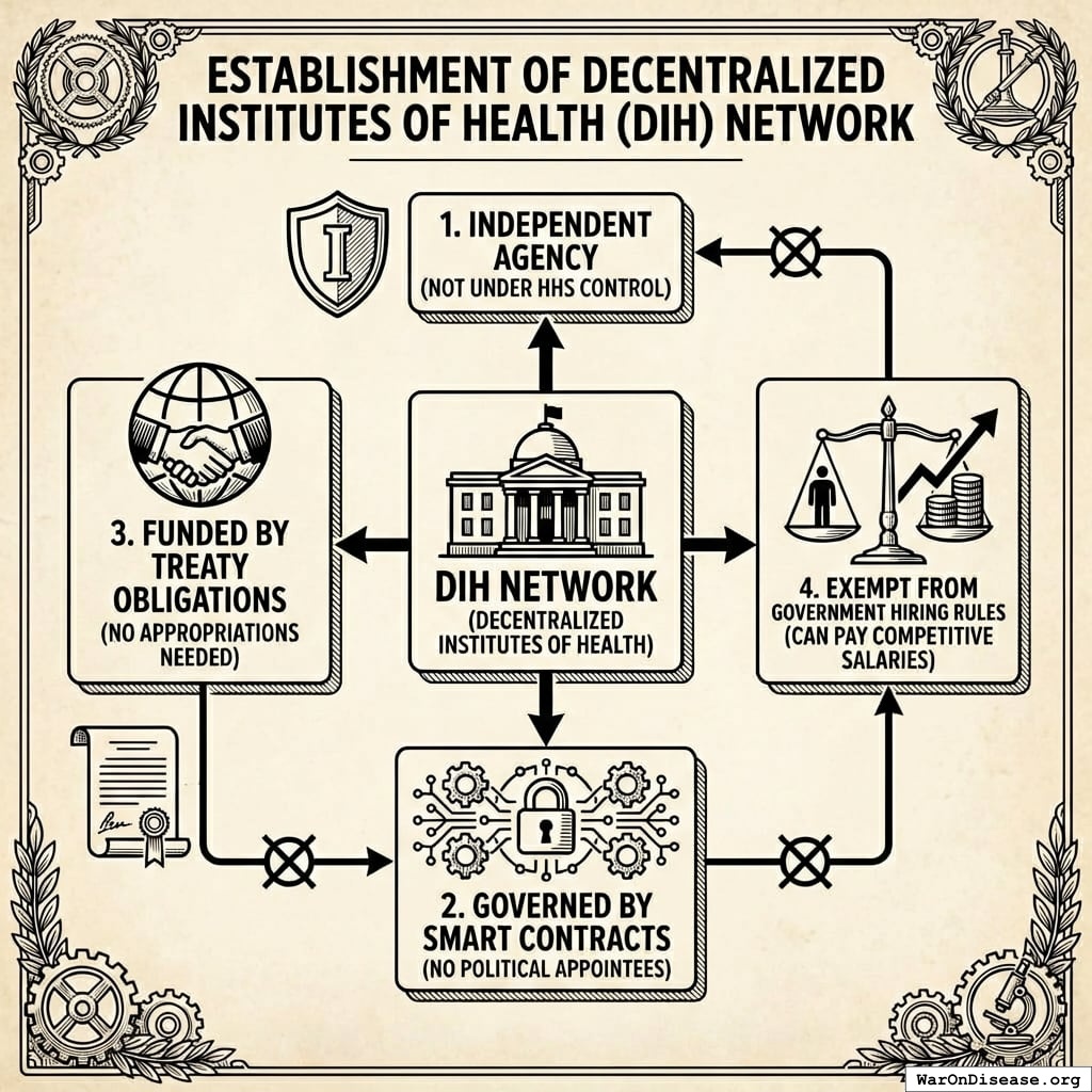 - “A decentralized institutes of health (DIH) network is created as an independent agency” (not under HHS control)