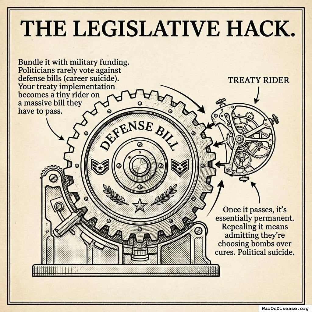Bundle it with military funding. Politicians rarely vote against defense bills (career suicide). Your treaty implementation becomes a tiny rider on a massive bill they have to pass.