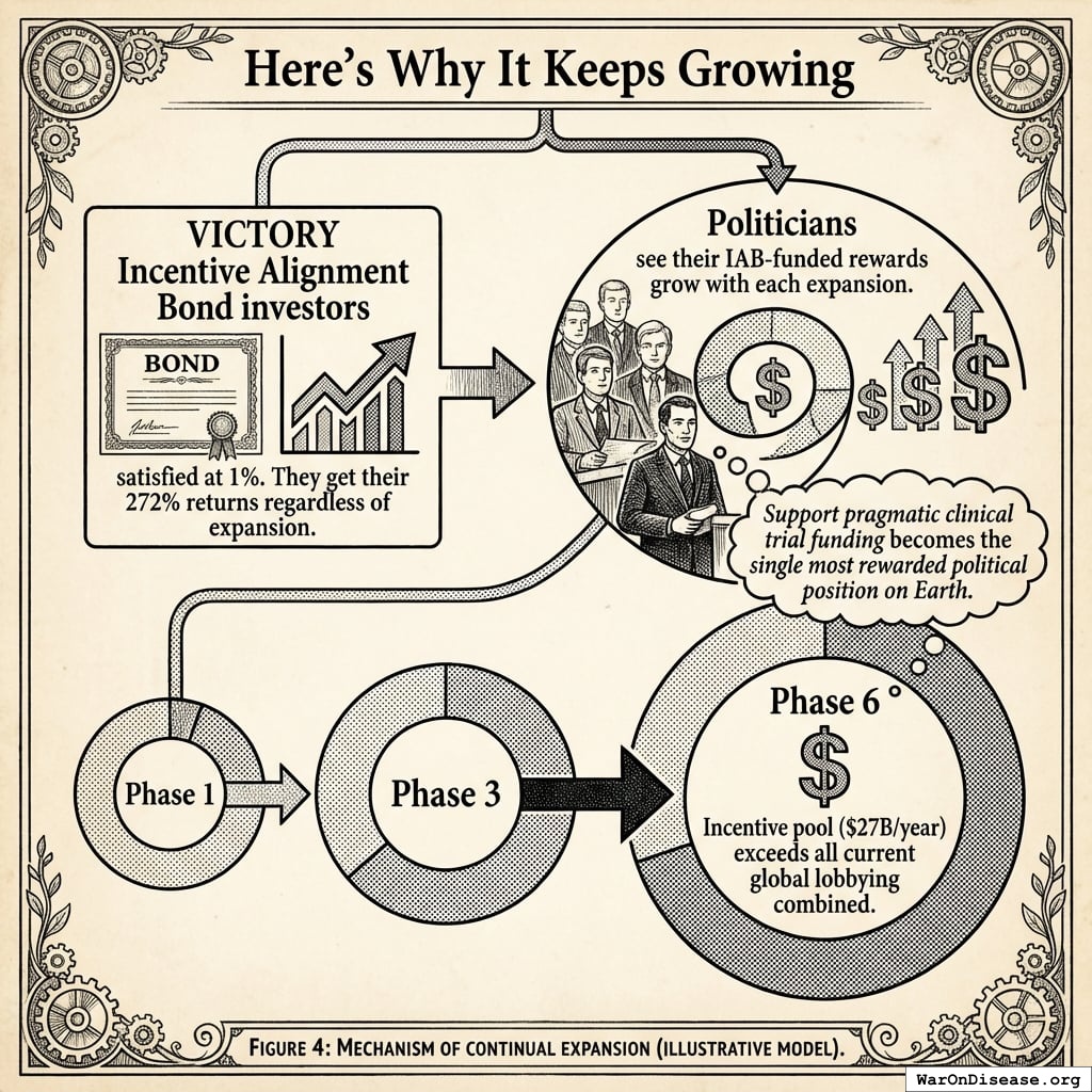 Politicians see their IAB-funded rewards grow with each expansion. By Phase 6, the political incentive pool ($27B/year) exceeds all current global lobbying combined. “Support pragmatic clinical trial funding” becomes the single most rewarded political position on Earth.