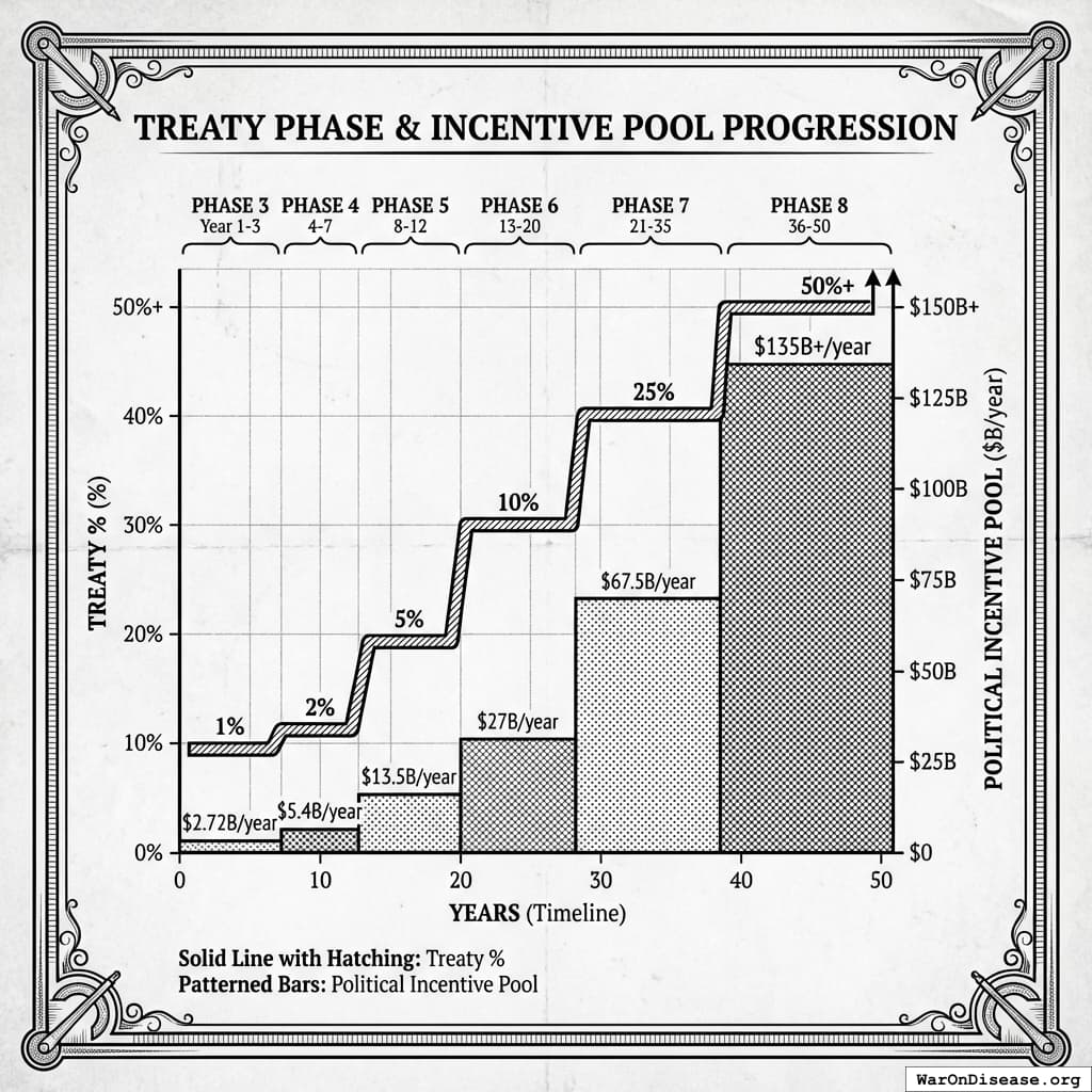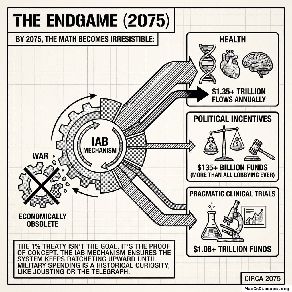 The 1% treaty isn’t the goal. It’s the proof of concept. The IAB mechanism ensures the system keeps ratcheting upward until military spending is a historical curiosity, like jousting or the telegraph.