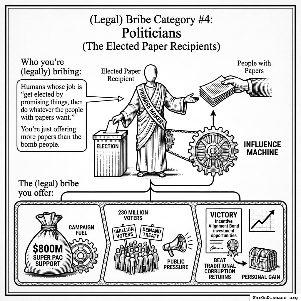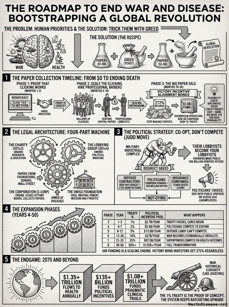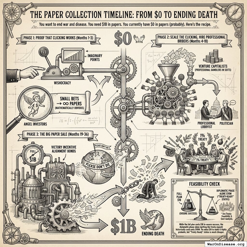3. Phase 3: The Big Paper Sale (Months 19-36). This is the final boss level. You launch VICTORY Incentive Alignment Bonds, which are like war bonds except backwards - you’re giving papers to humans to STOP making corpses instead of START making corpses. This raises the full $1B you need to overwhelm the opposition, run a global “please don’t die” advertising campaign, and get the 1% treaty signed by actual governments who thought weapons were the only option.