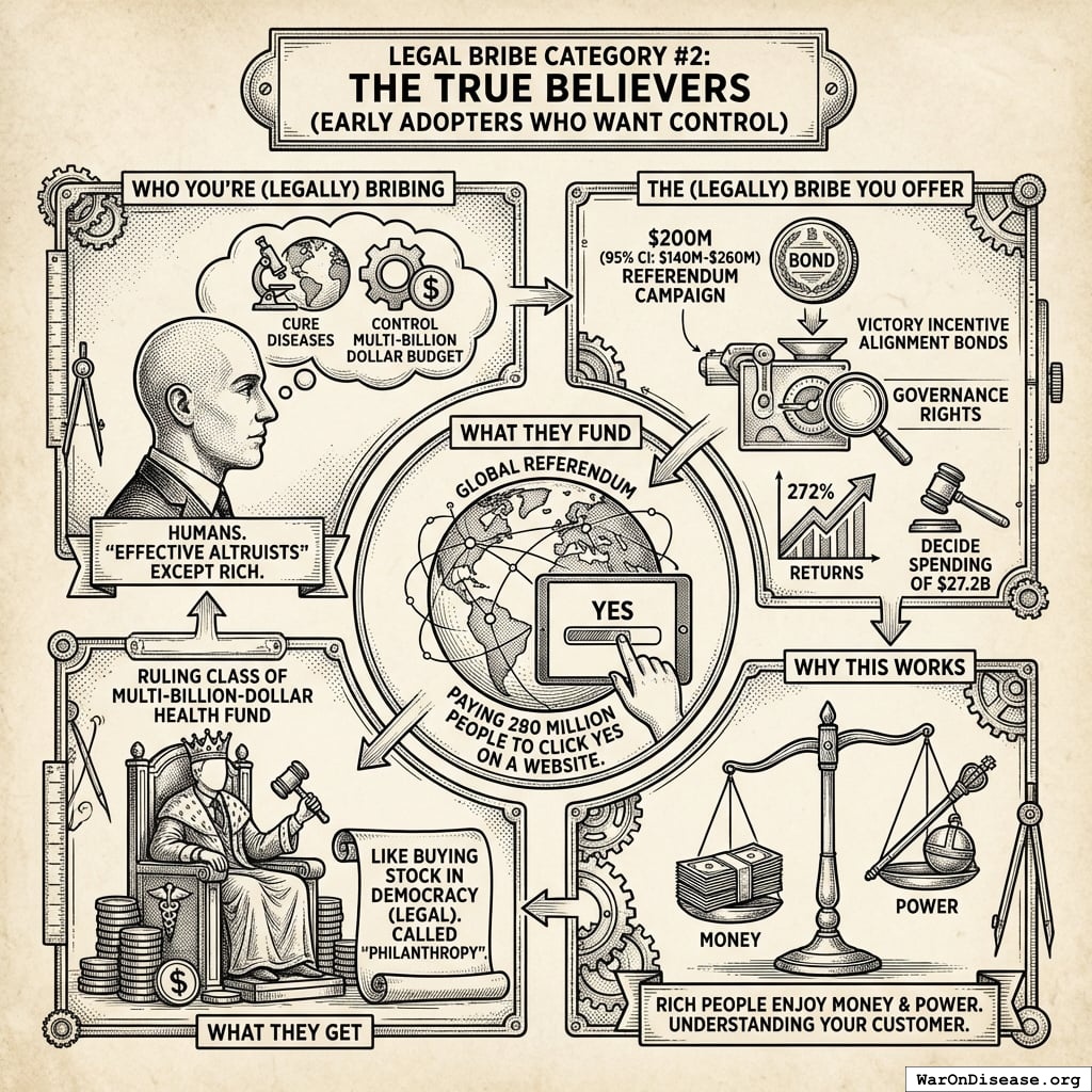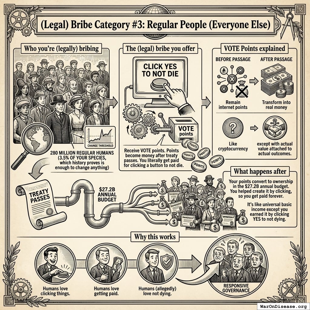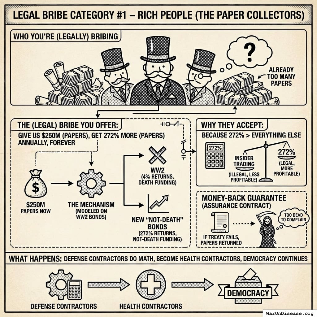3. Phase 3: The Big Paper Sale (Months 19-36). This is the final boss level. You launch VICTORY Incentive Alignment Bonds, which are like war bonds except backwards - you’re giving papers to humans to STOP making corpses instead of START making corpses. This raises the full $1B you need to overwhelm the opposition, run a global “please don’t die” advertising campaign, and get the 1% treaty signed by actual governments who thought weapons were the only option.