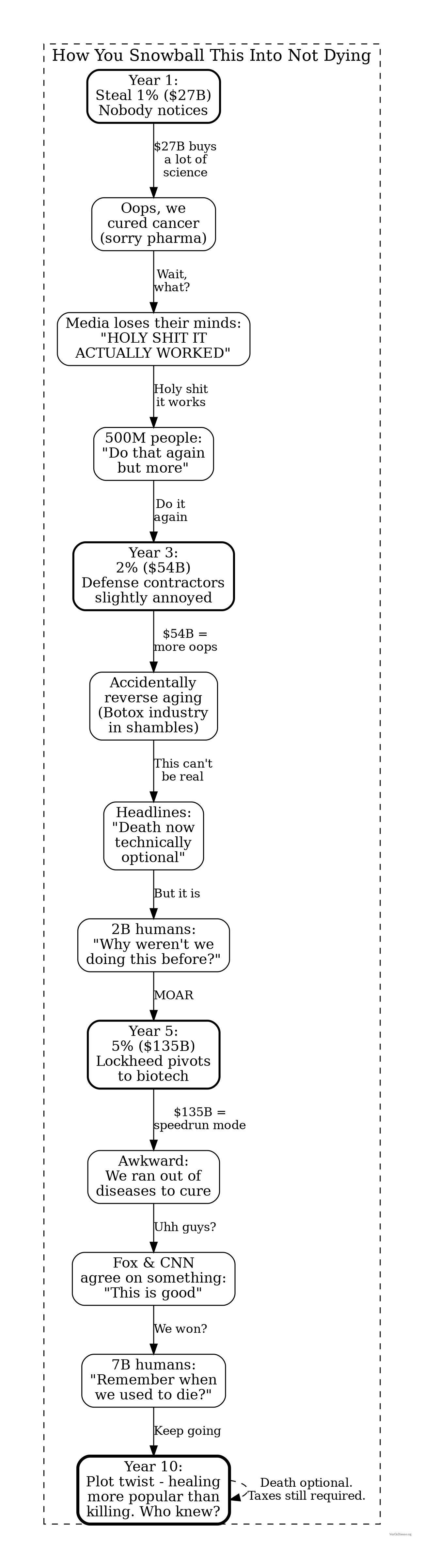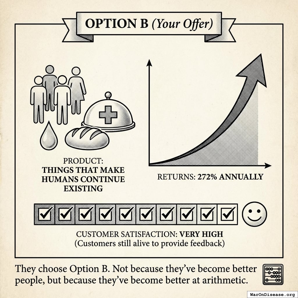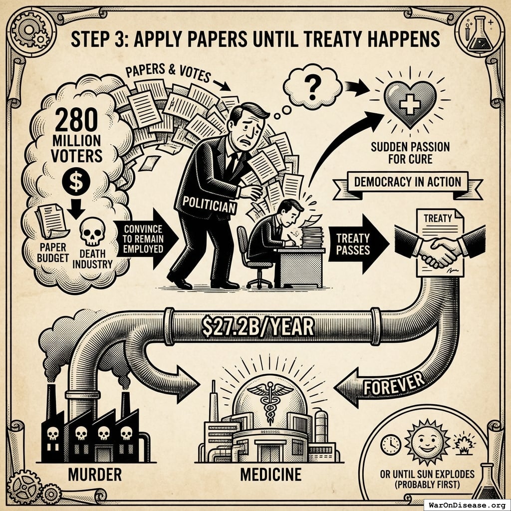 A 1% treaty passes. $27.2B annually begins flowing from the murder budget to the medicine budget. Diseases start getting cured. Death becomes slightly less inevitable. Investors get very wealthy. Everyone acts surprised that this worked, even though the math was obvious.