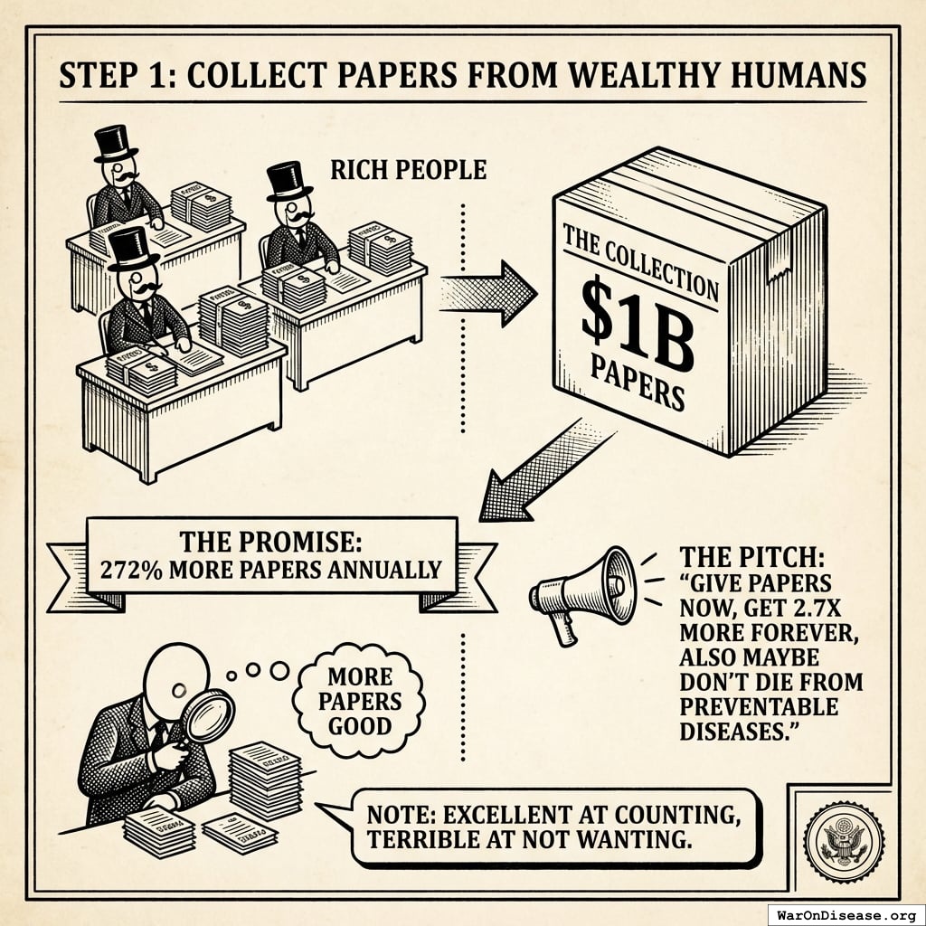 The pitch is simple: “Give us papers now, get 2.7 times more papers forever, also maybe don’t die from preventable diseases.” Even humans who think vaccines cause 5G can understand “more papers good.”