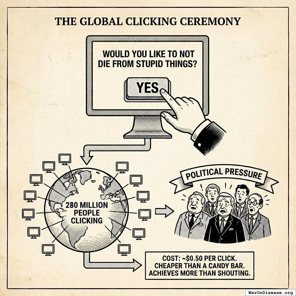 Use some papers to launch a global clicking ceremony where 280 million people click “YES” on a website. This costs about 50 cents per click, which is cheaper than a candy bar and achieves more than most political movements involving shouting.