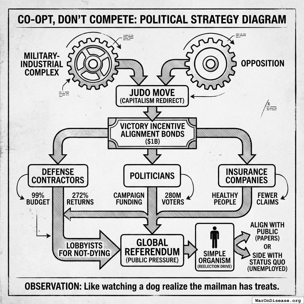 The strategy is simple: make it more profitable for everyone - military contractors, politicians, insurance companies - to support the treaty than to oppose it. You’re not fighting greed. You’re redirecting it, like a judo move but with capitalism.