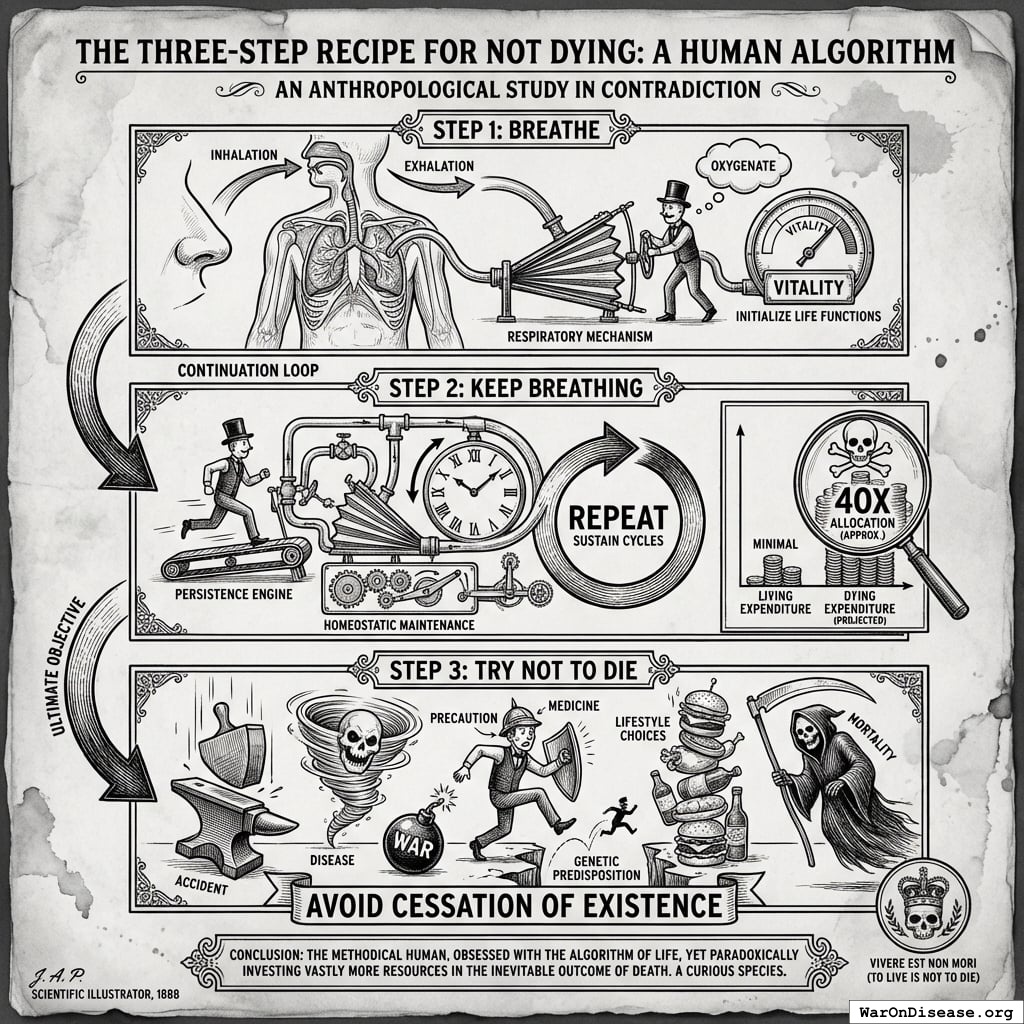 Humans love steps. You put them on everything. Step 1: Breathe. Step 2: Keep breathing. Step 3: Try not to die. You’re very methodical about staying alive, which makes it curious that you spend 40 times more on dying.